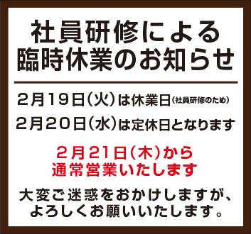 少し先のお話になりますが2月19日(火)が臨時休業となります。