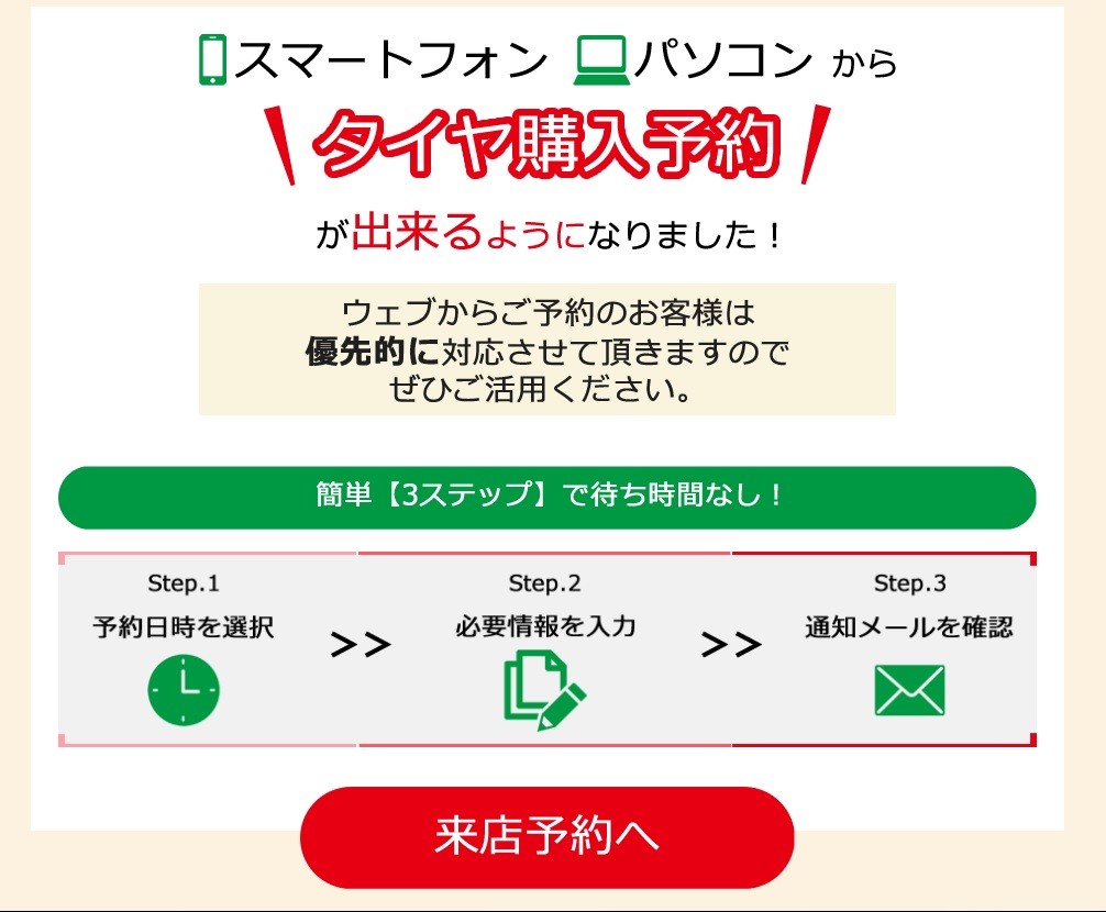 このHPに【タイヤ購入予約】とある所をクリックして頂きますとWEBで予約ができます。