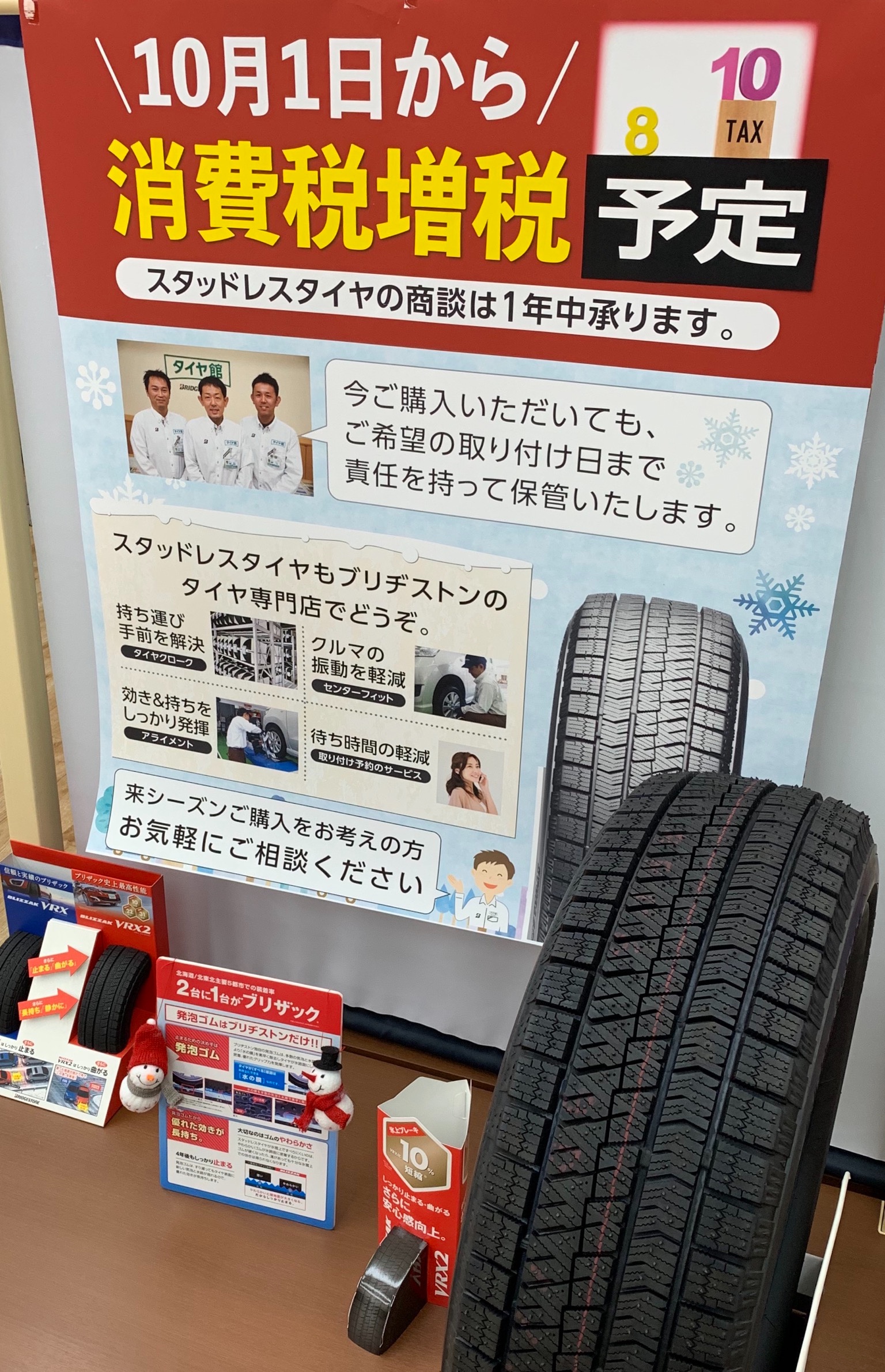 いつもご利用頂きありがとうございます。今年新車を購入された方、冬の準備を早めにされてはいかがでしょうか?10月より消費増税が実施となれば現状から2%アップ。特に大型乗用車の方は金額が大きくなる可能性がある為少し早めにこの夏、ご購入をお勧めします!まずは一度当店でご相談下さい(^ ^)