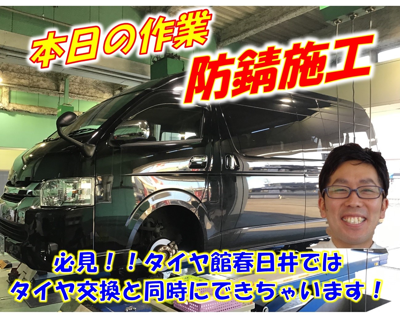 本日の作業「ハイエース」タイヤ交換・防錆施工