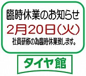 こんにちは、関口です。 今月からメンバ-が入れ替わり新しいタイヤ館春日井としてこれからもより安全安心なカ-ライフをサポ-トさせて頂きます! 寒いですが、スタッフ一同元気にがんばっていきますのでどうぞよろしくお願い致します! 早速ですが・・・ 再来週の火曜日になりますが2月20日は臨時...