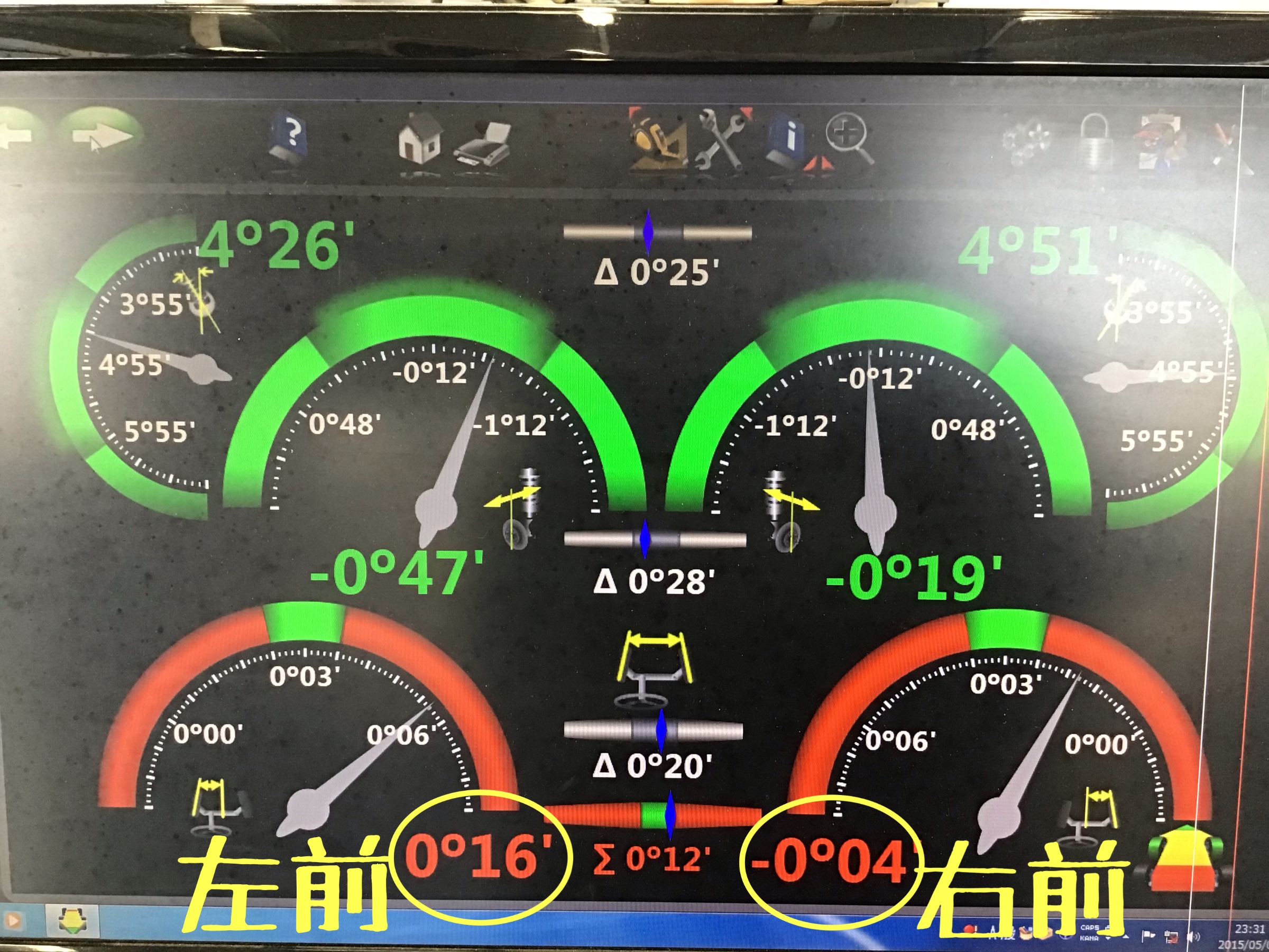 タイヤの取り付けが終われば次にお車の点検のアライメントの測定をしていきます。