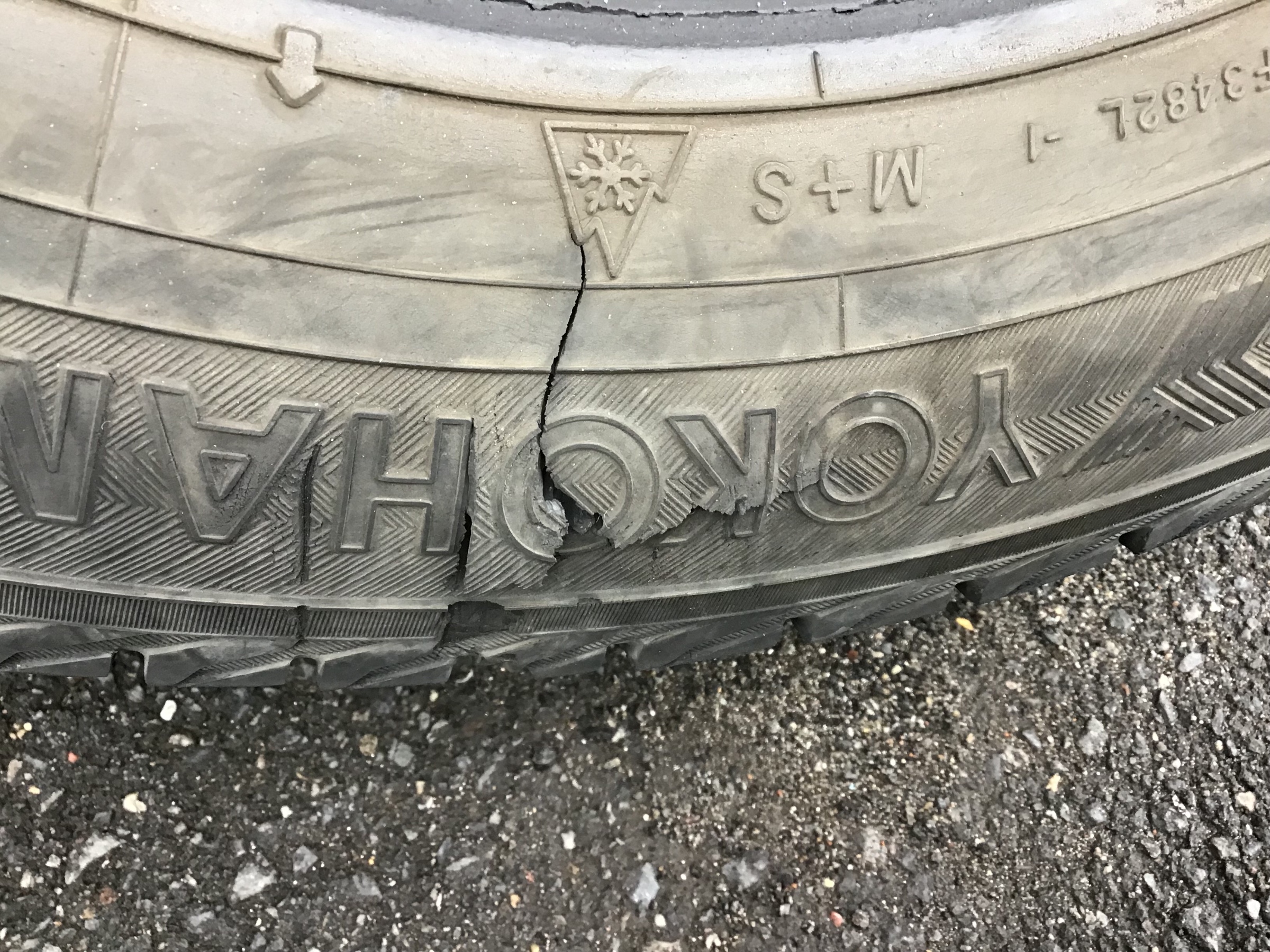 縁石にぶつかってしまったとのことで、タイヤの横が裂けてしまっています。