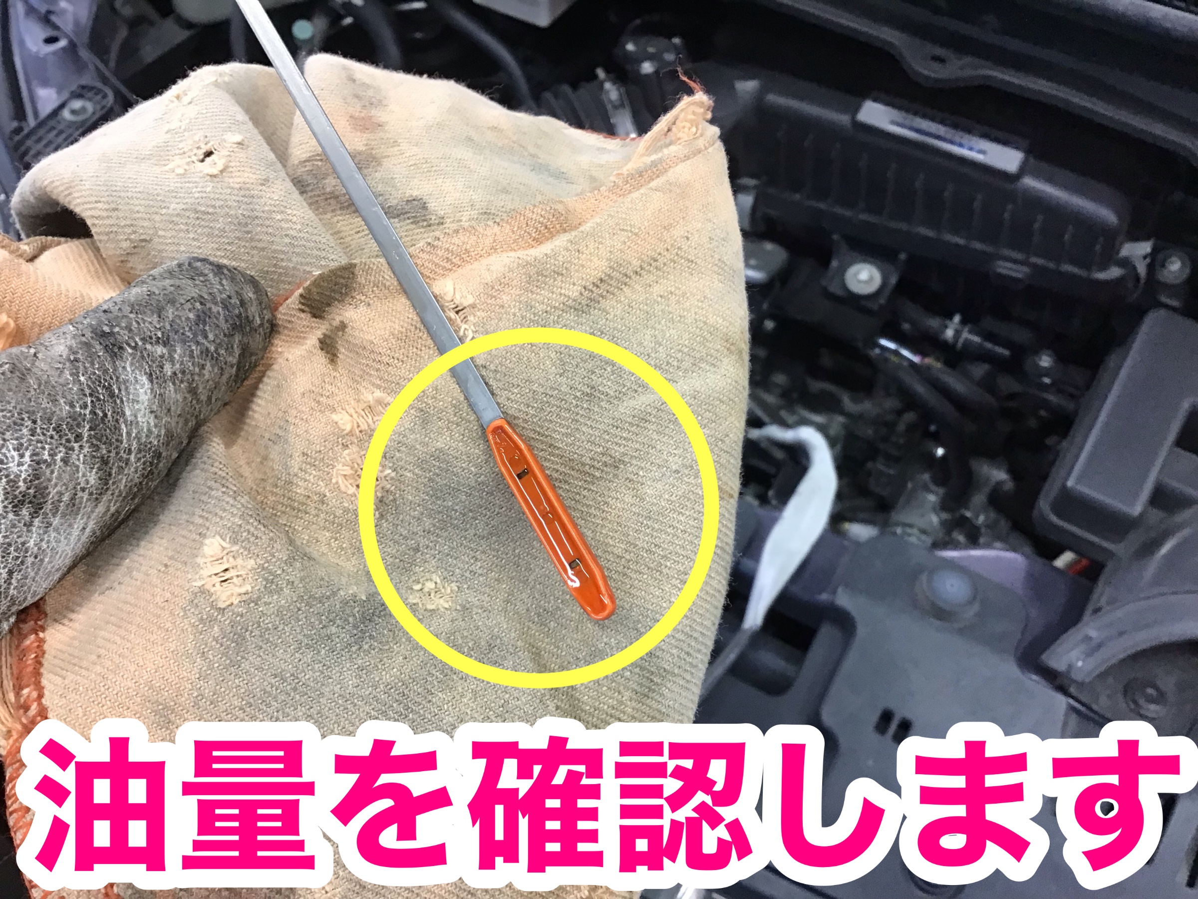 オイルを入れ終わったら、最後にレベルゲージで規定量入っているか確認します。