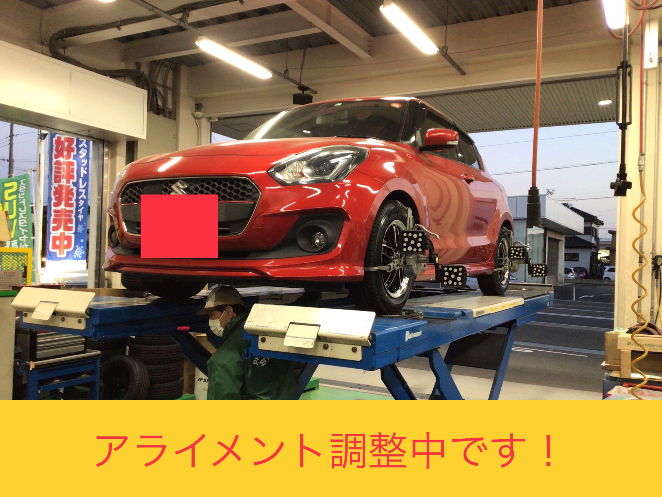 スズキ『スイフト』でスタッドレスタイヤ交換と、アライメント調整を実施したのでご紹介です。