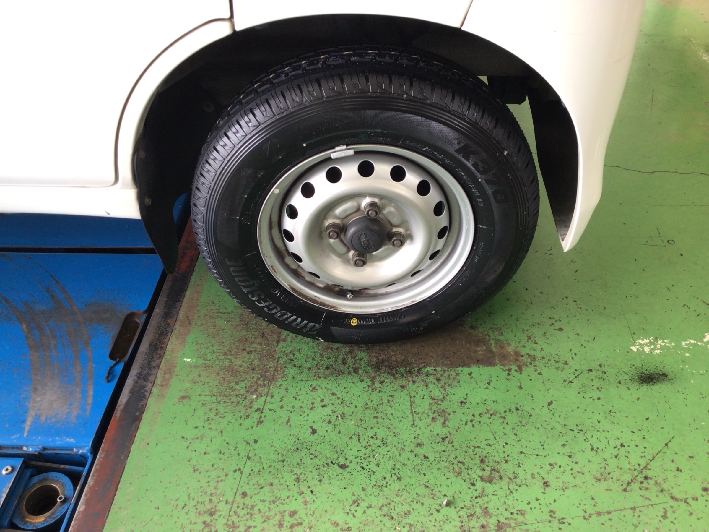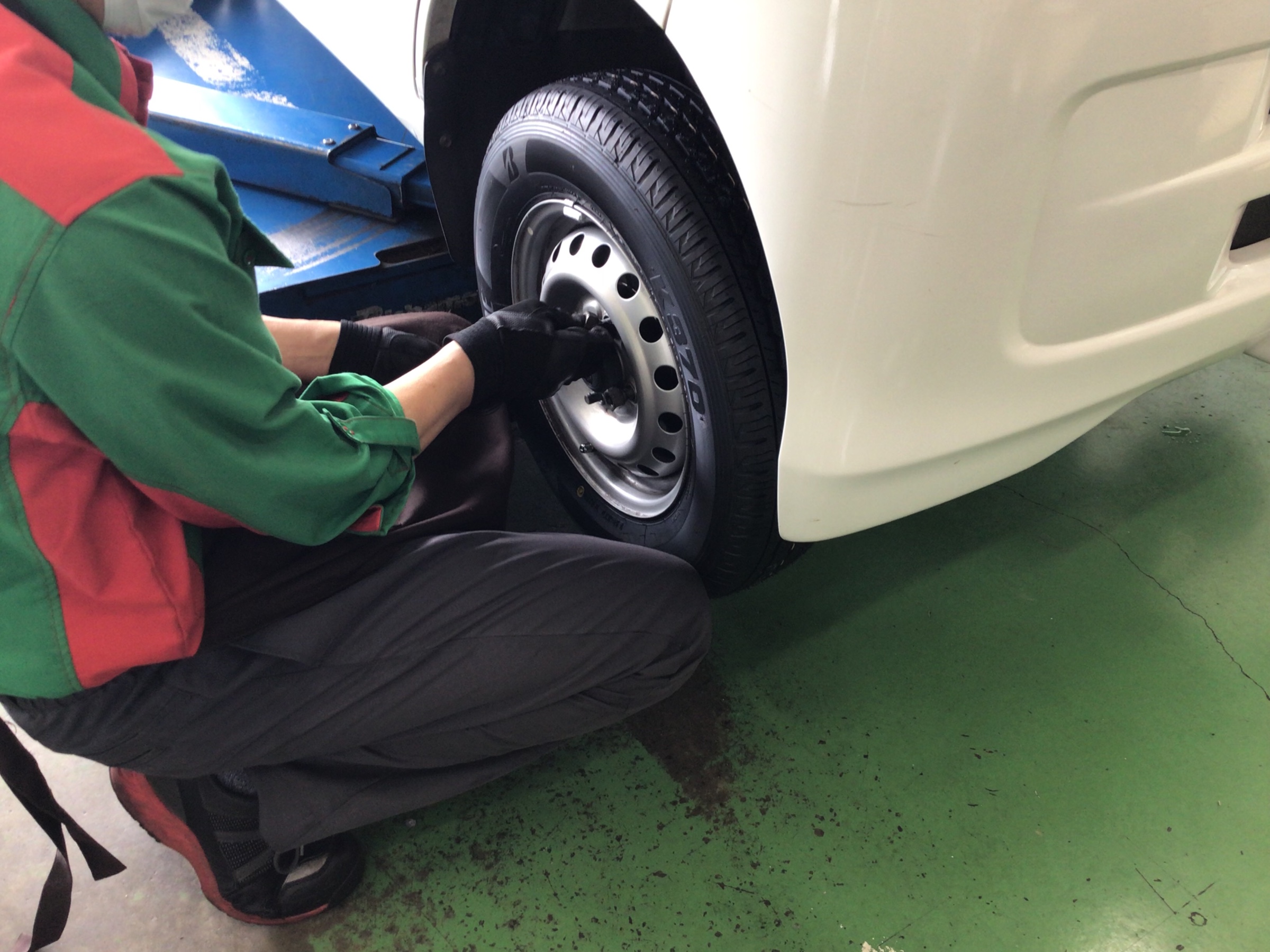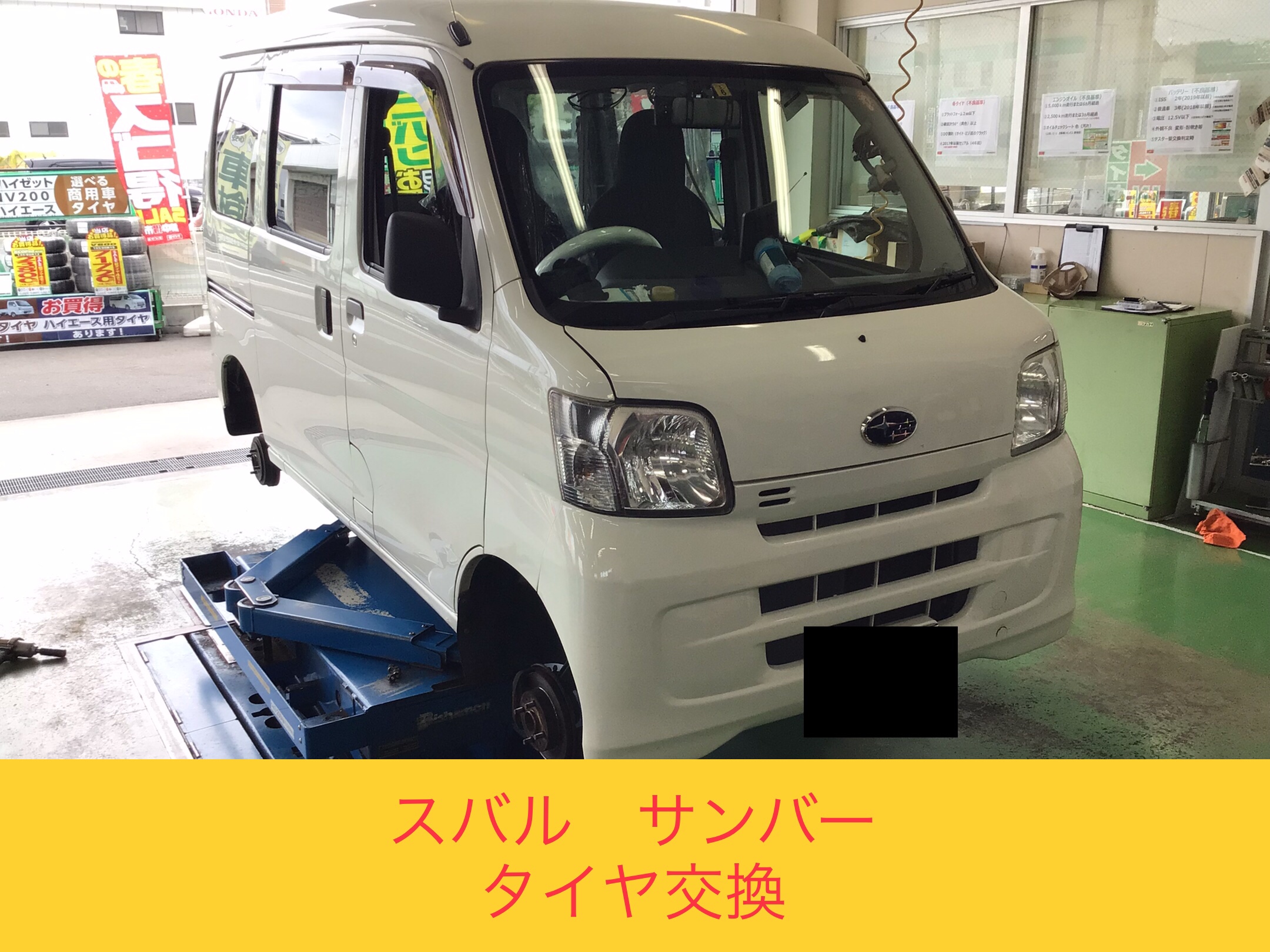 スバル『サンバー』で、タイヤ交換を実施中です!