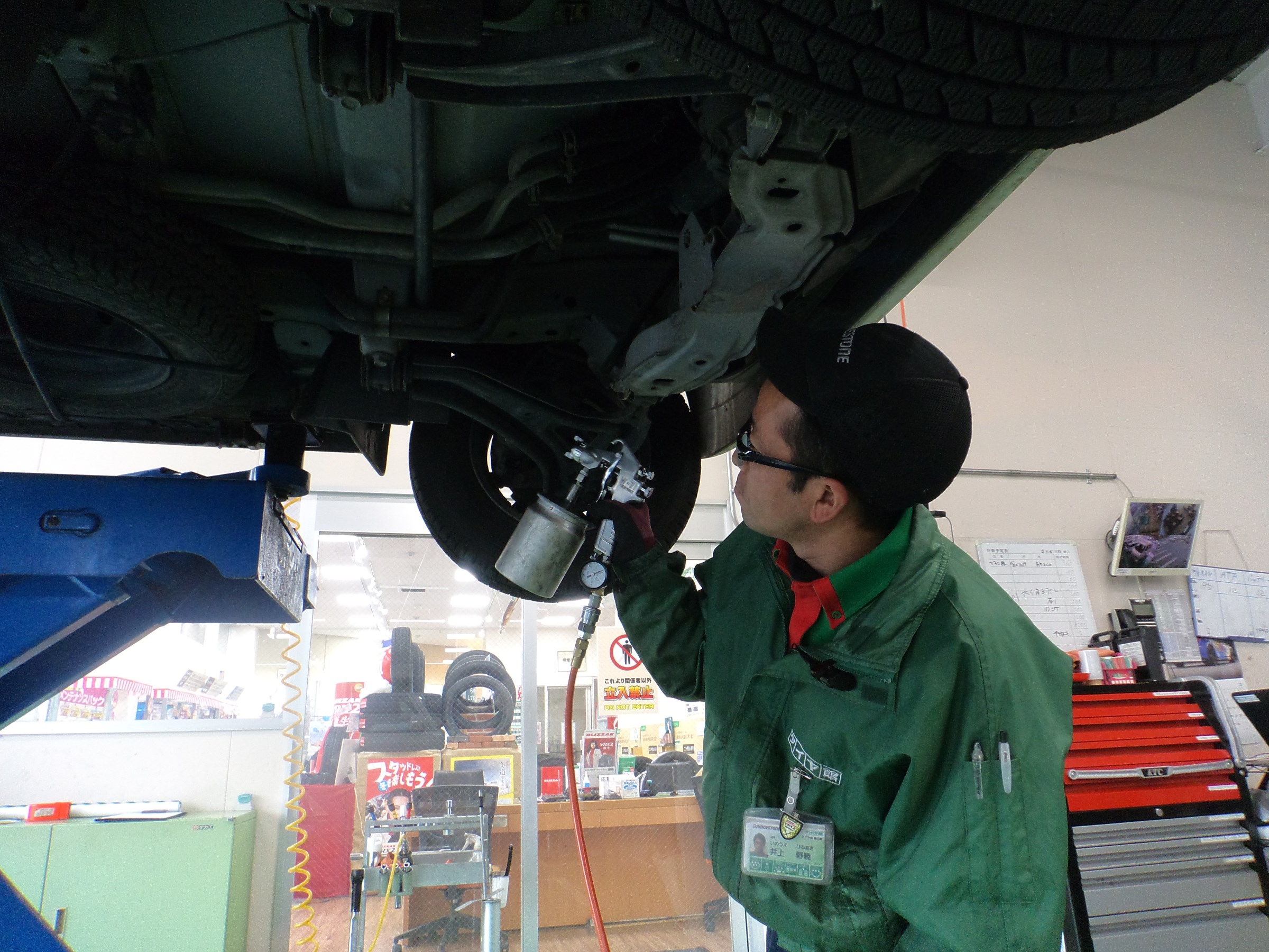 こんにちわ、写真は車両下回りを防さびコーティング中です♪