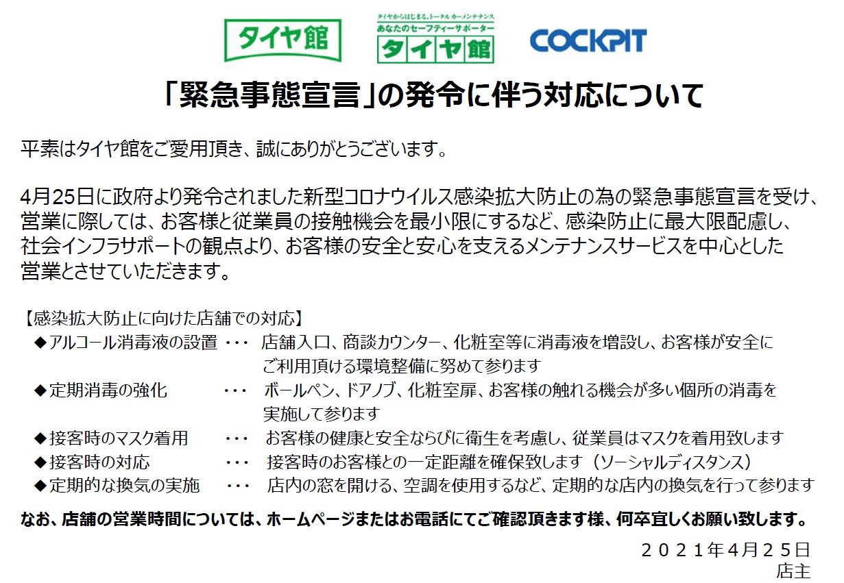 4/25より発令されます緊急事態宣言に伴う営業について ポスト 2021年4月24日 いつもタイヤ館交野店をご利用いただき 誠に有難う御座います。 4/25より発令されます、緊急事態宣言に伴う 営業について、 感染予防に最大限に配慮し社会インフラサポートの 観点より、お客様の安全と安心を支えるメンテナンスサービスを 中心とした営業を変わらずさせていただきます。 担当:スタッフ一同
