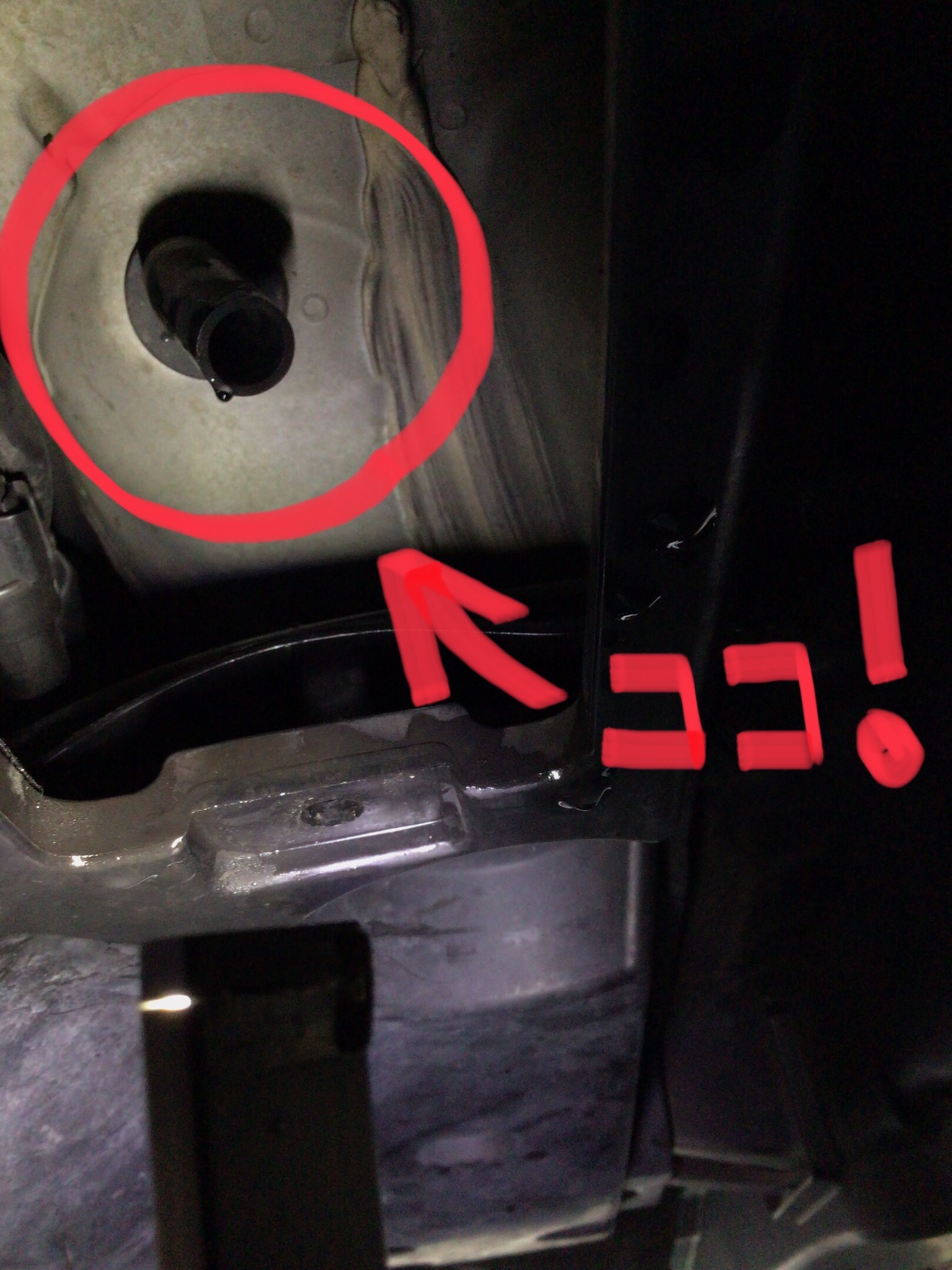 まず車のお腹から出ている黒いチューブ(写真赤マル)