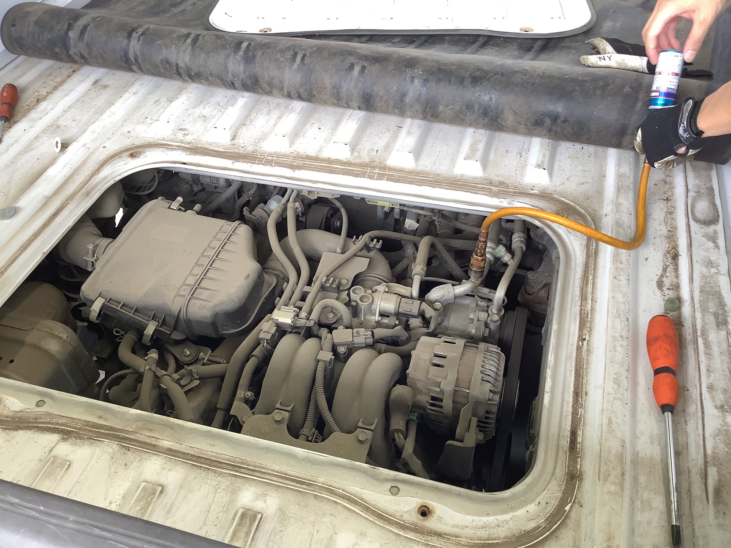 サンバーはエンジンの位置がお車のお尻の位置にあるので、
