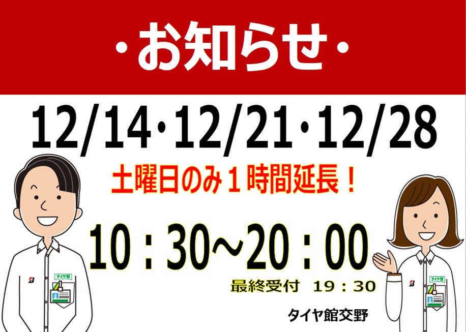 12/14・12/21・12/28 各土曜日営業時間延長決定!!