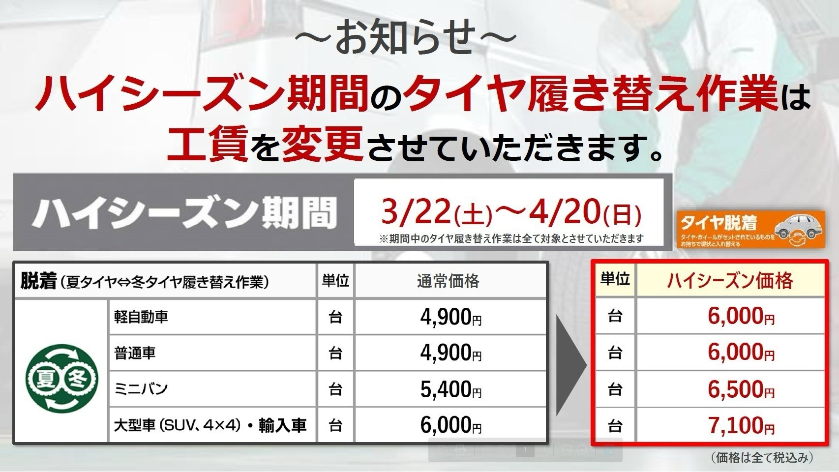 こちらの期間中はタイヤ履き替え作業の料金を変更させて頂きます。