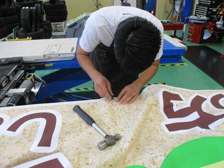 爽やかボーイ野村君が似合わないハンマーを持って何か布のような物を叩いていました。