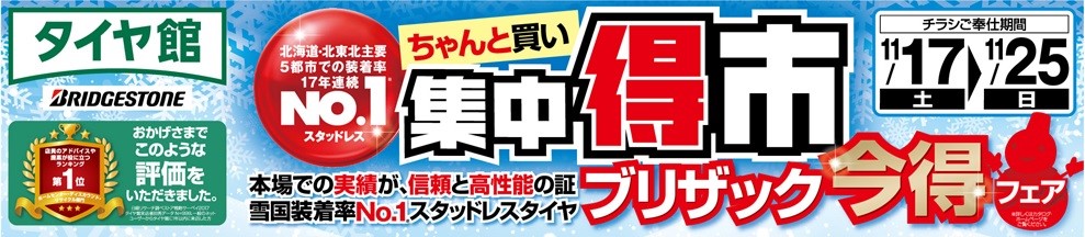 タイヤ館交野では【集中得市】開催!11/17~11/25までお買い得期間となります!