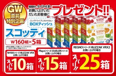 期間中タイヤ4本ご成約でBOXティッシュ・・・5箱