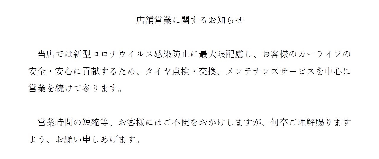 4月度営業日のお知らせ ポスト 2020年4月10日 いつもタイヤ館交野店ホームページご覧頂き、ありがとうございます! ☆★☆4月定休日のお知らせ☆★☆ 4/7 4/14 4/21 4/28 火曜日が定休日となります。 ※※※ご来店の際はお気をつけ下さい※※※ 4/7からの緊急事態宣言の為、 4/13〜5/6までの期間は営業時間短縮させて頂きます。 カテゴリ:お知らせ
