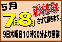 8日(水)は申し訳ございませんが休業日です。 5月 9日より通常営業しております お間違えの無いようご来店下さい♪ その他火曜日5月7・14・21・28日は通常定休日となりますので、 ご迷惑をお掛けしますが 何卒、宜しくお願い申し上げます<(_ _)>