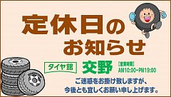 タイヤ館交野店のHPをご覧頂きありがとうございます! 本日、6月26日(火)は定休日となっております ご迷惑をお掛けしますが、よろしくお願い申し上げます。