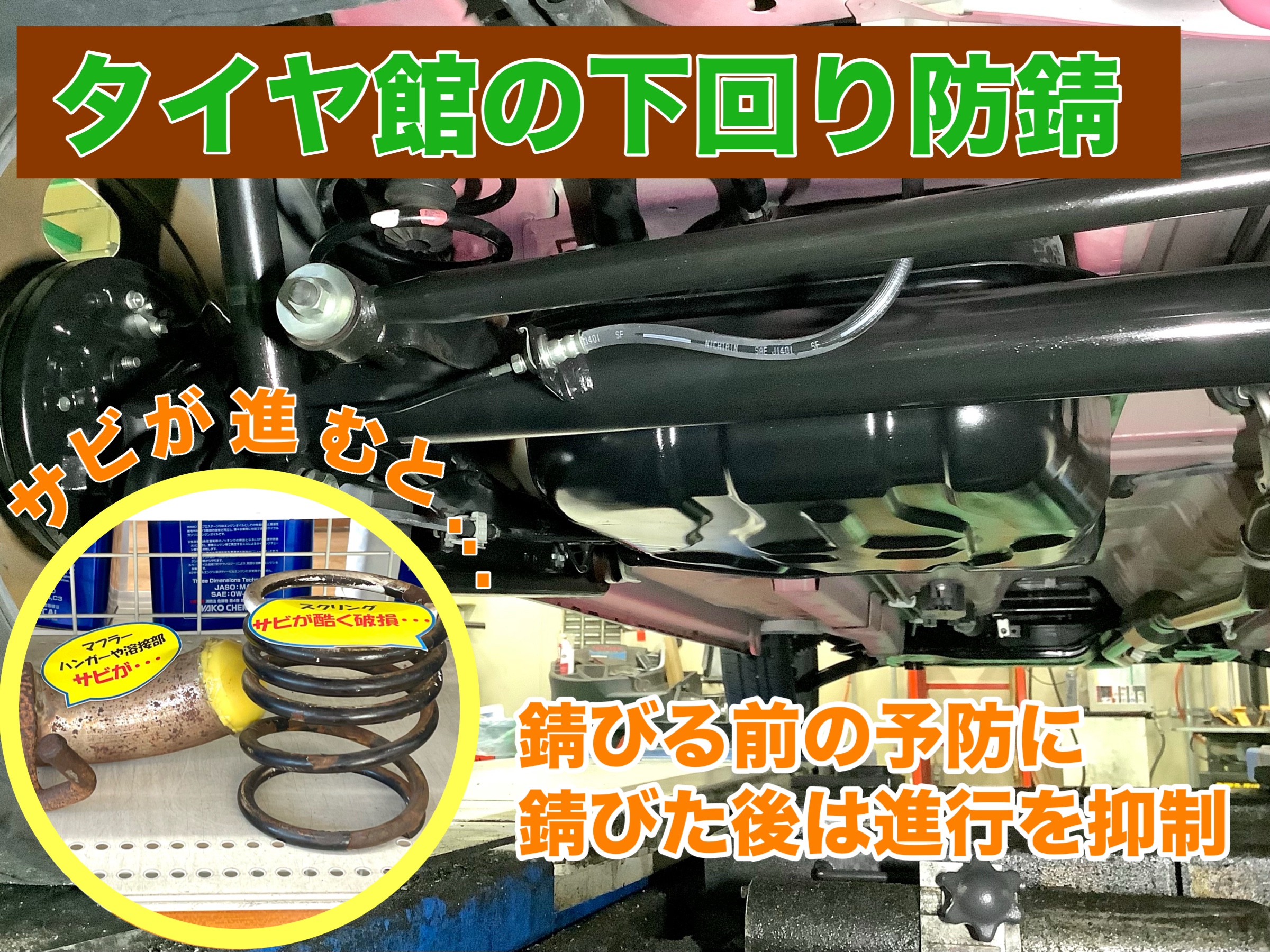いつもタイヤ館交野店を ご利用いただきありがとうございます。 今回はタイヤ館の下回り全体防錆の お話をさせていただきます。 全体防錆とは、マフラーを含む、お車の下回り 全体のサビ止めを行うメニューになります。 車の下回りには鉄製の部品が多く 使われているため、 ① 凍結防止剤に含まれる...