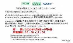 大阪府に緊急事態宣言が発令され 新型コロナウィルス感染防止対策として 当店では給茶機・キッズコーナーのご利用を お控えいただいております。 営業時間も 4月13日(月)から5月6日(水)まで 10:30~17:00に変更させていただきます。 ご迷惑をおかけしますがご協力お願いします。