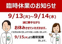 9/13(火)9/14(水)臨時休業のお知らせ★メール相談・WEB予約受付中☆