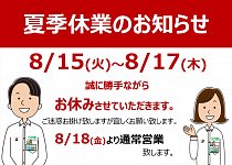 8/15(火)~8/17(木) 臨時休業 水曜日もメール相談・WEB予約受付中★☆