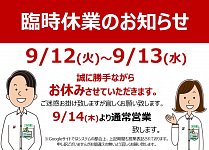 9/13(水)臨時休業のお知らせ★メール相談・WEB予約受付中☆