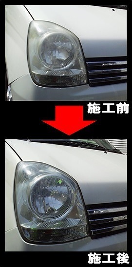当店では、業務専用の特殊なベース処理剤でヘッドライトレンズ表面の黄ばみやくすみを取り除き、しっかり下地処理を施した後に耐候性・耐久性・密着性の高い特殊コーティングを施工しております。このコーティング剤は常温で硬化し、ヘッドライトレンズ表面にガラス状の硬質被膜を形成するので紫外線や熱からしっかりヘッドライトレンズ表面を守ってくれますよ(*^-^*)