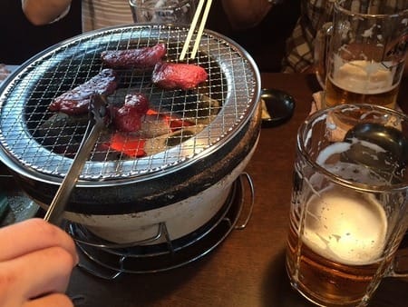 1.炭火でホルモン焼きます→2.タレに付けます→3.食べます→4.ビールを飲みます→5.1へ戻る