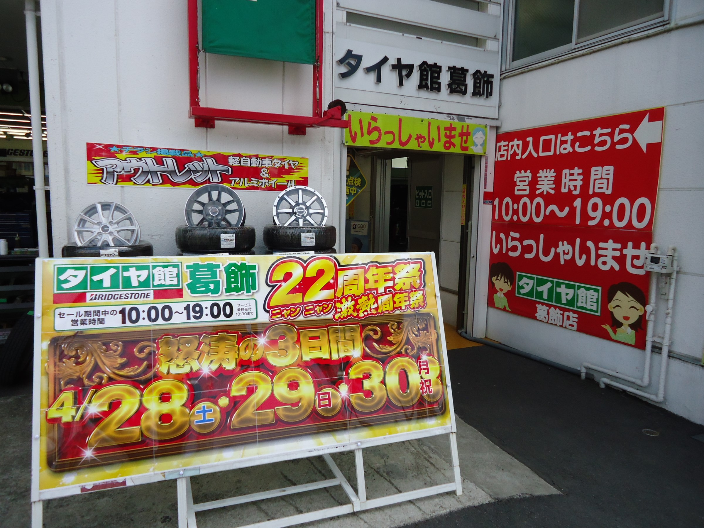 おかげさまで22周年祭を終えることが出来ました。 ポスト 2018年5月1日 皆様のおかげで22周年祭を無事終えることが出来ました。 多くのお客様にご来店頂き感謝、感謝、感謝です。 野菜つめ放題も大盛況でした。 また5/6まで引き続きゴールデンウィークセール開催中です。 23周年に向けて新たな気持ちでスタート! 今後ともタイヤ館葛飾をよろしくお願い致します。 担当:!