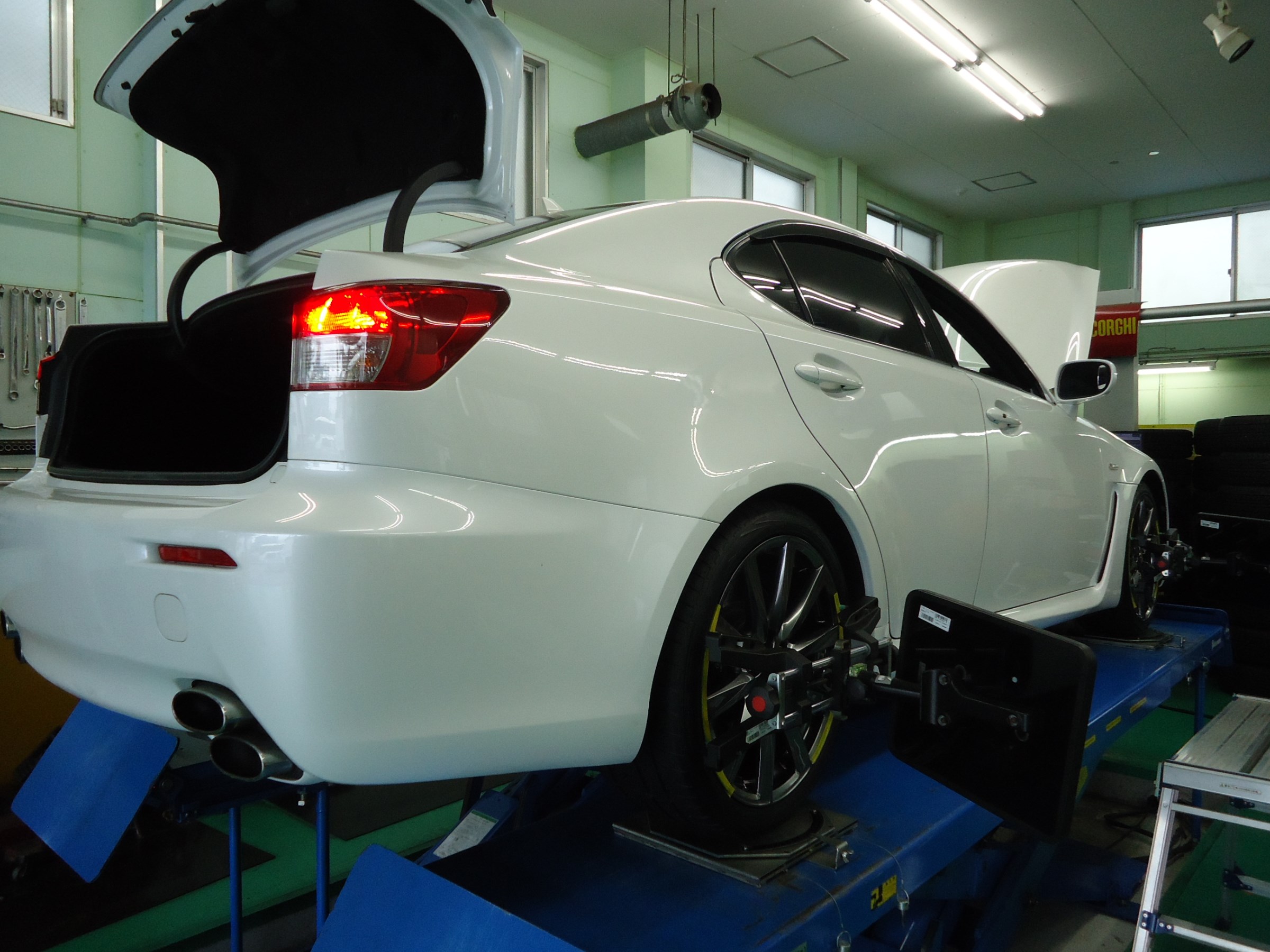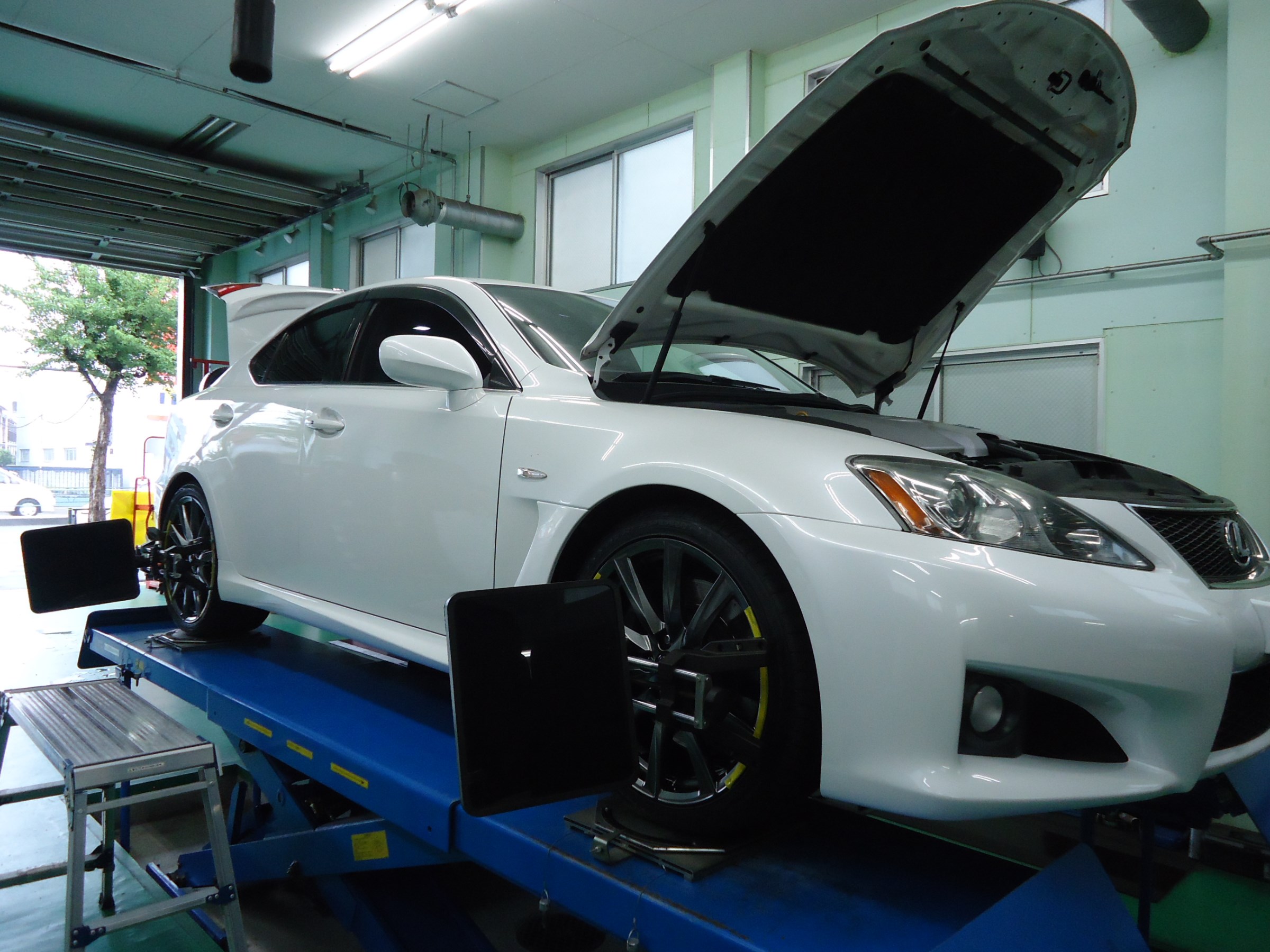 レクサスIS-Fアライメント調整。 ポスト 2018年8月8日 今日はレクサスIS-Fのアライメント調整です。 走行中ホイールをぶつけてしまったとの事で調整させていただきました。 今日の夜から台風が来るみたいなので念のため土嚢の準備。 シャッターや出入口に置いて帰宅します。 担当:大谷