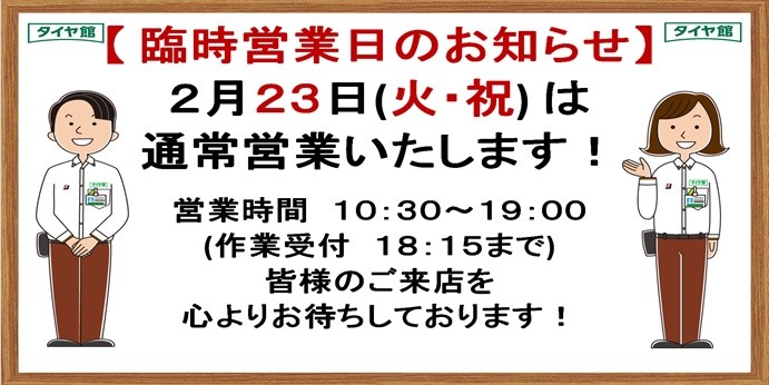 2月23日(火・祝)は通常営業いたします!! ポスト 2021年2月22日 いつもタイヤ館 河内長野のホームページをご覧いただきありがとうございます! 【 臨時営業の営業のお知らせ 】 2月 23日(火・祝) タイヤ館 河内長野は通常営業いたします♪♪ 作業内容・受付時間なども通常通りですので、 タイヤ・カーメンテナンスのことなら タイヤ館 河内長野へぜひお立ち寄りください! パンクなどの緊急時もご相談ください。 みなさまのご来店を心よりお待ちしております!