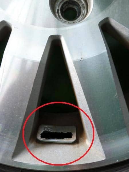 ホイールの外側(デザイン側)に貼り付けタイプのバランスウェイトを