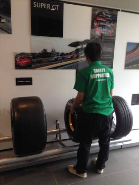 GTカーのタイヤホイールと、普段使ってもらっているタイヤとの重さを持ち比べたり。