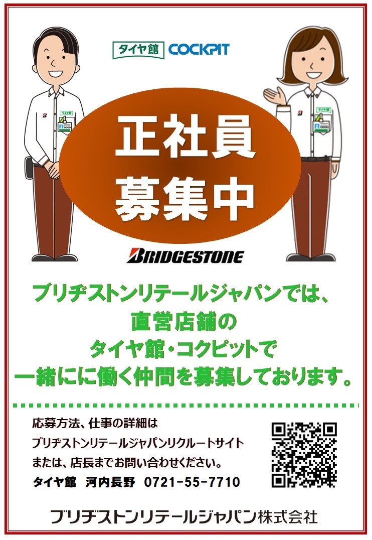 正社員募集中!! 【 タイヤ館 河内長野 】 ポスト 2021年10月1日 タイヤ館 河内長野では現在、正社員を募集しています! 仕事内容はタイヤをはじめとするカー用品のご案内。車の知識を身につけ、タイヤやメンテナンス商品の提案や交換作業を行います。 車好きの方、男性の方はもちろん!女性の方、未経験の方も大歓迎です☆ 自動車運転免許証以外の資格は不要です♪ 仕事の詳細、応募方法は下記のリクルートサイトよりお願いいたします。【BRJリクルートサイトURL】https://www.bridgestone.co.jp/group/brj/recruit/saiyou/ タイヤ館 河内長野大阪府河内長野市西之山町3-30721-55-7710 ------------------------------------------------------------------ ご不明な点はお問い合わせください。ご応募お待ちしております。
