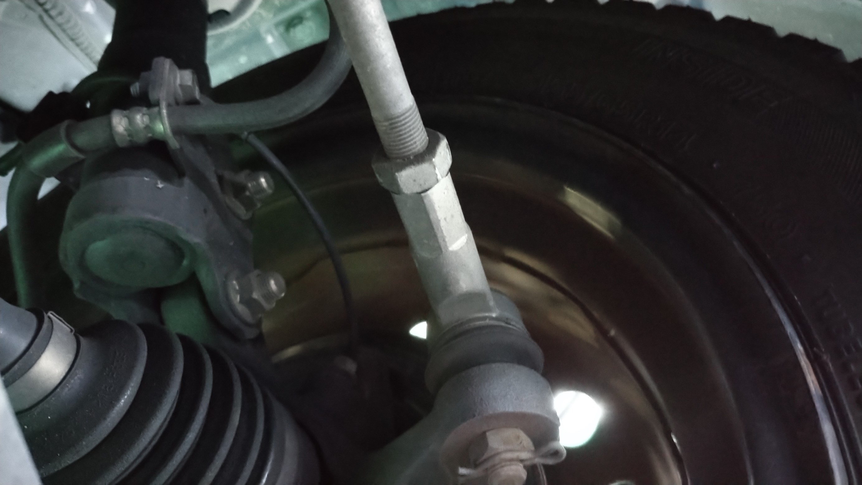 モニターをチェックしながらこのタイロッドを伸び縮みさせタイヤの取り付け角度をメーカー指定の”基準値”に合わせていきます。綺麗に整いましたー!!