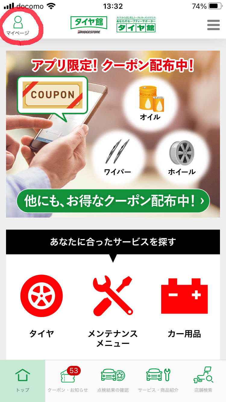 ステップ2.アプリのトップ画面左上にあるマイページを押してください(赤丸の個所)