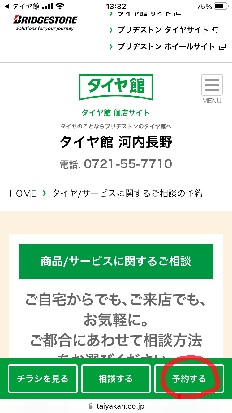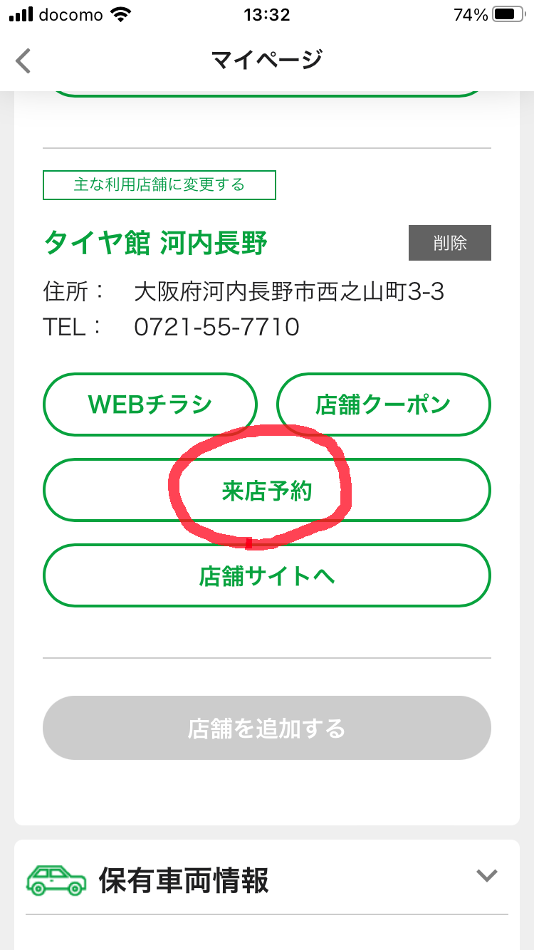 ステップ3.ご登録いただいている店舗の来店予約を押してください(赤丸の個所)