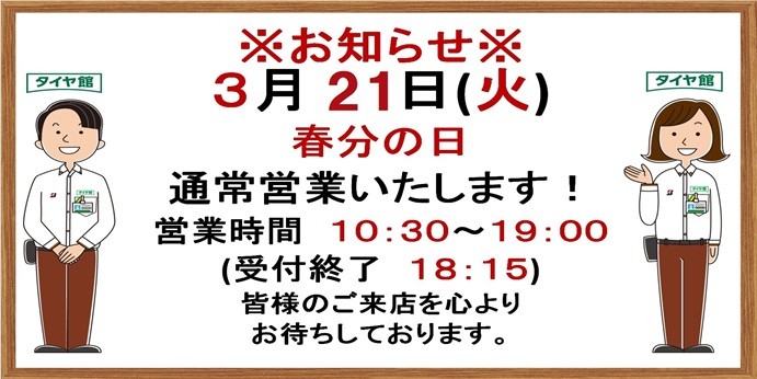 本日 3月21日(火)は通常営業いたします!!