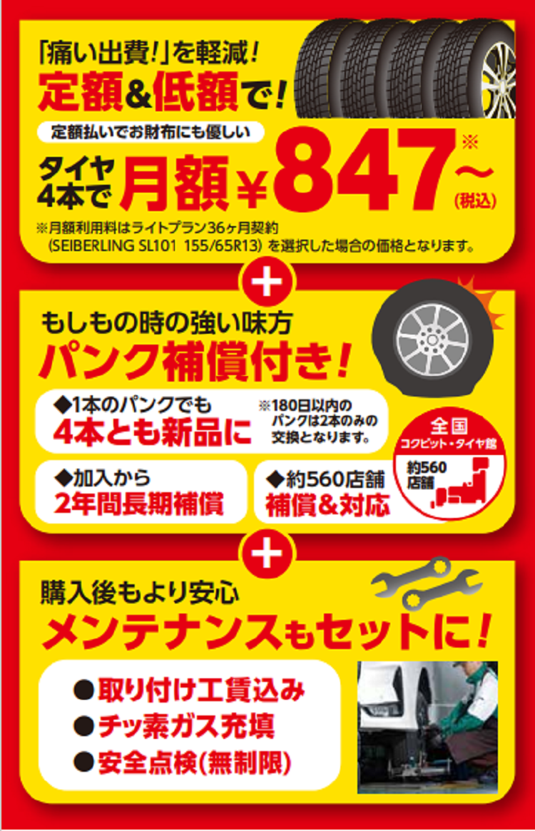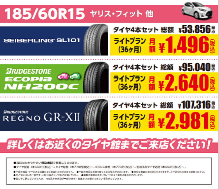 タイヤのサブスク月額847円(税込)~ 【軽・コンパクト】 ポスト 2024年2月1日 タイヤ館 河内長野 住所:586-0024大阪府河内長野市西之山町3-3 電話番号: 0721-55-7710 相談予約 タイヤ点検・安全点検/タイヤ履き替え/オイル交換/その他ピット作業の予約