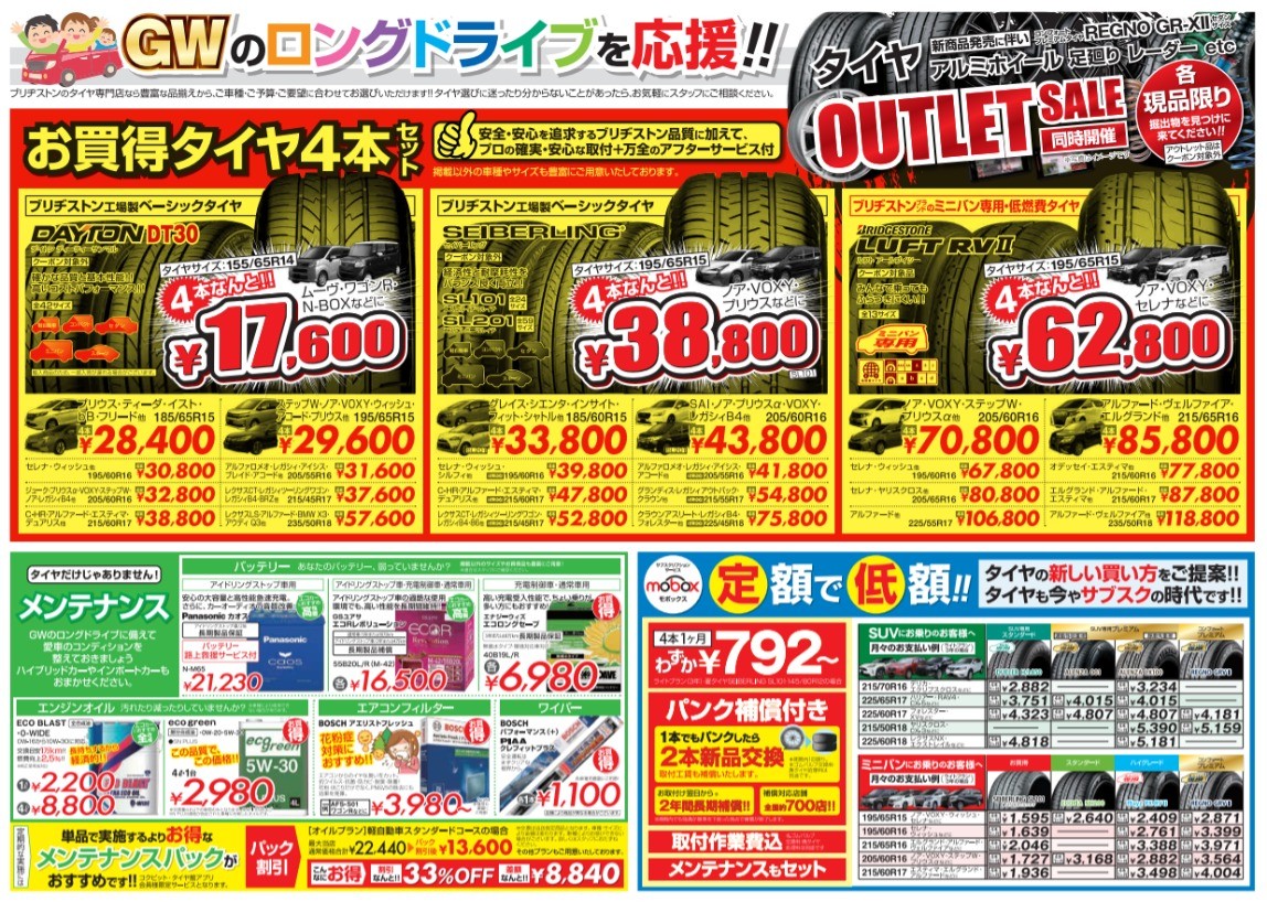 期間中、ブリヂストンブランドのタイヤ4本ご購入時に