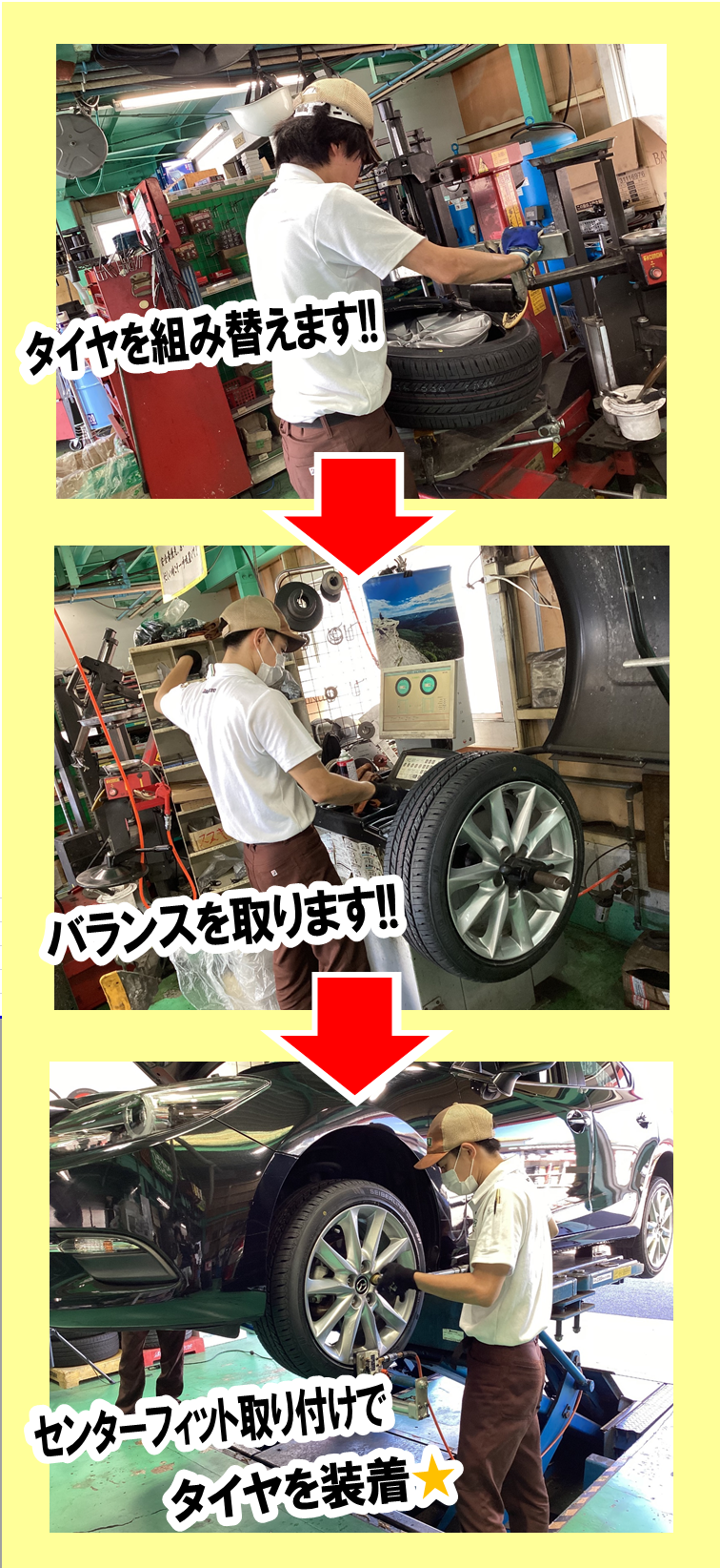 タイヤ交換と一概に言ってもこんなにもたくさんの工程があるんです。