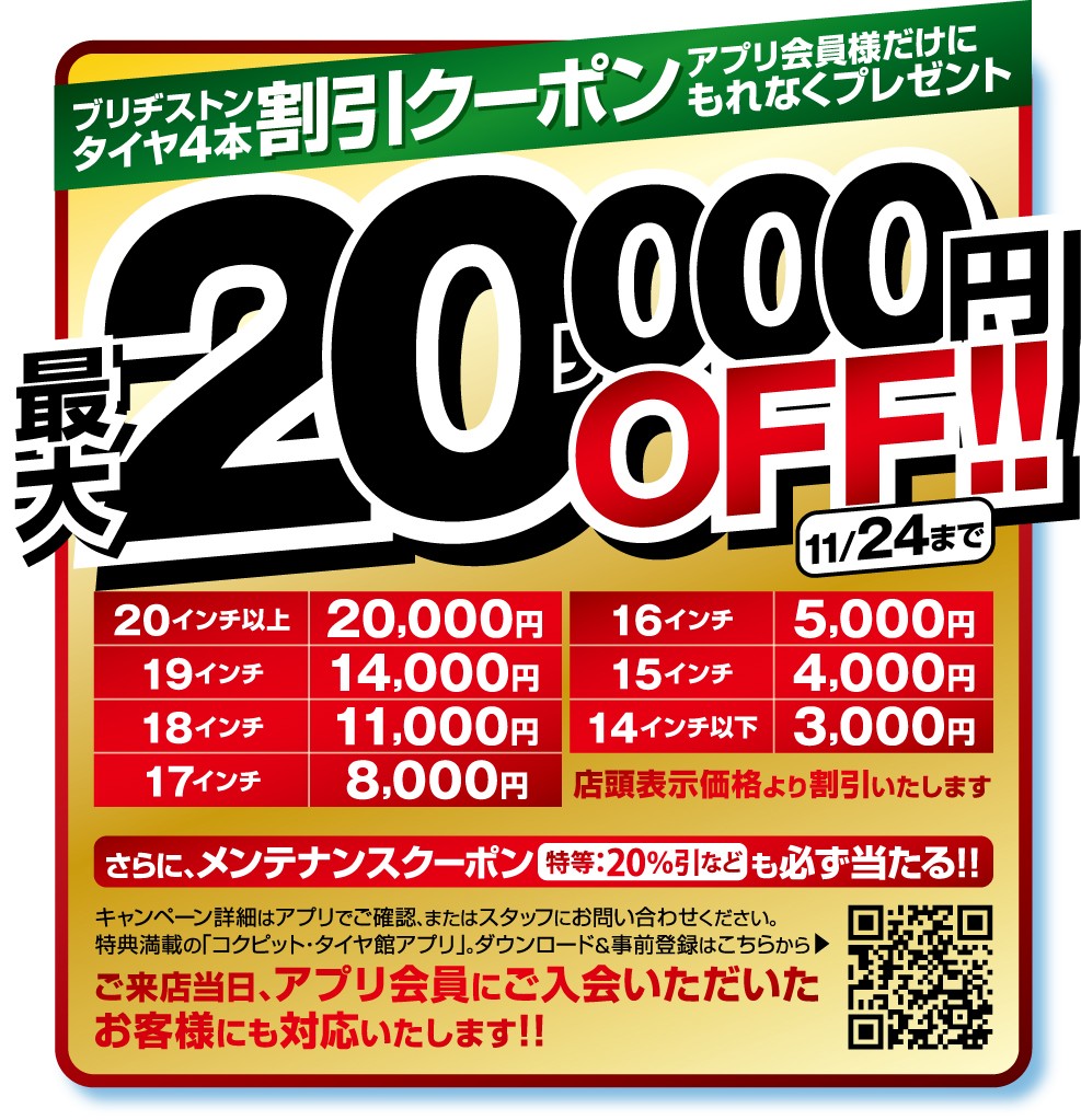 20インチ以上の方は最大20,000円割引クーポン発行されます!