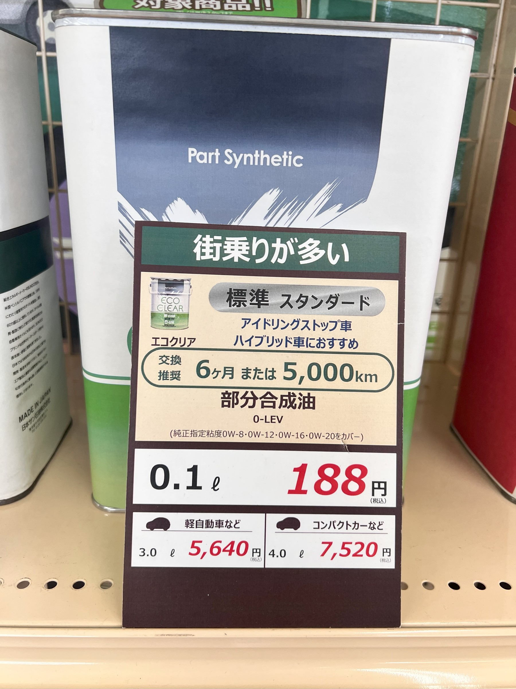 粘度は、0-LEV(純正指定粘度0W-8・0W-12・0W-16・0W-20をカバー)、部分合成油。