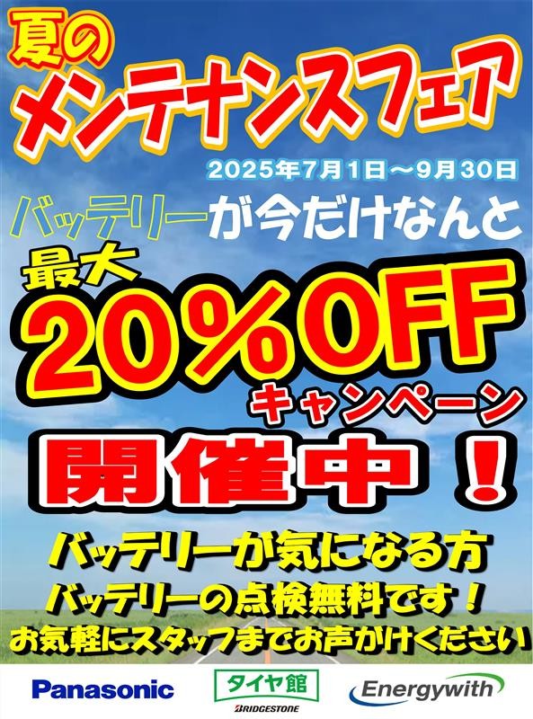 夏のバッテリーフェア開催中! バッテリーが最大20%OFF♪♪