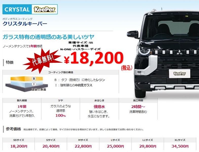 人気No.1のクリスタルコーテングは18,200円~(ワゴンR・ムーヴキャンバス等)