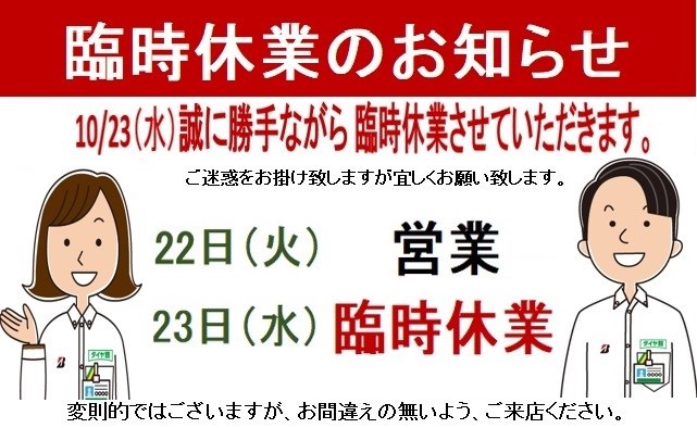 10:30~19:00 ※タイムズの駐車場内に店舗がございます。お見積りのみのお客様、空気圧点検だけのお客様にも無料駐車券をお渡しさせて頂きます。