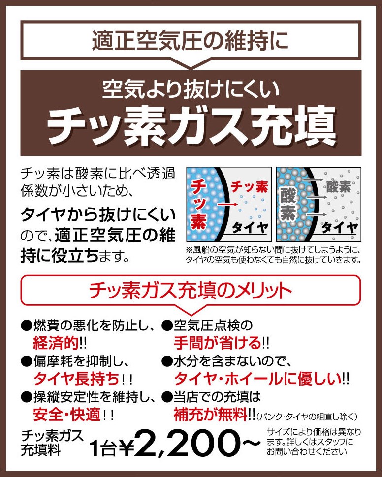 空気より抜けにくい、チッ素ガスの充填をおすすめしております。