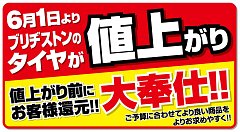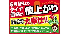 既にご存知の方も多いかと思いますが、 6月1日(木)よりタイヤ価格が値上がり致します! タイヤ交換をお考えの方はお急ぎ下さい!! 今月中のお買い求めが絶対にお得ですよ♪ まずはタイヤの点検だけでもお気軽にご来店下さい!!