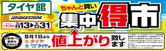 タイヤ館河内長野のホームページをご覧いただき、誠にありがとうございます! お得なセールのお知らせです!! 今週末、7月13日(土)より、 お客様還元『集中得市』の開催が決定致しました!! 8月1日からのタイヤ値上がり前に、 ブリヂストン製タイヤを大放出いたします! 値上がり前のラストチャ...